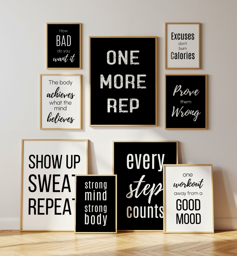 This powerful set of 48 Digital Fitness Art Prints brings energy and motivation straight to your walls. Print them yourself to save money and customize your space with high quality 300 DPI art in the sizes (and colors) that suit your space/gym best!